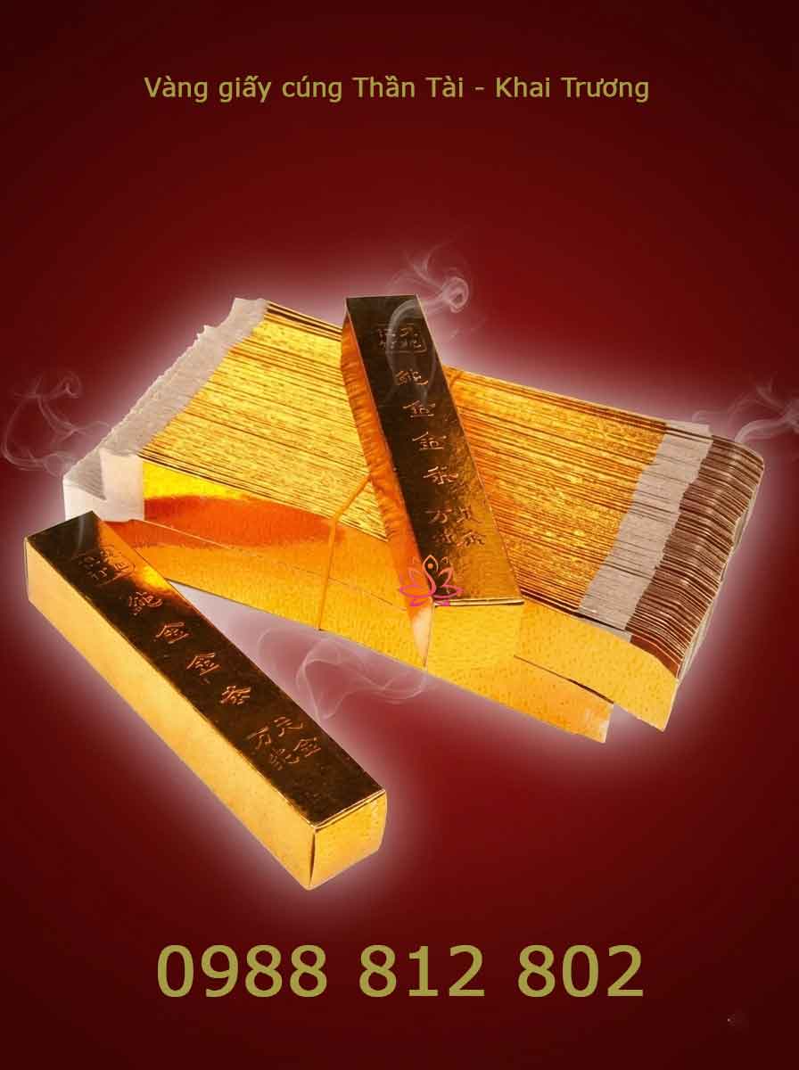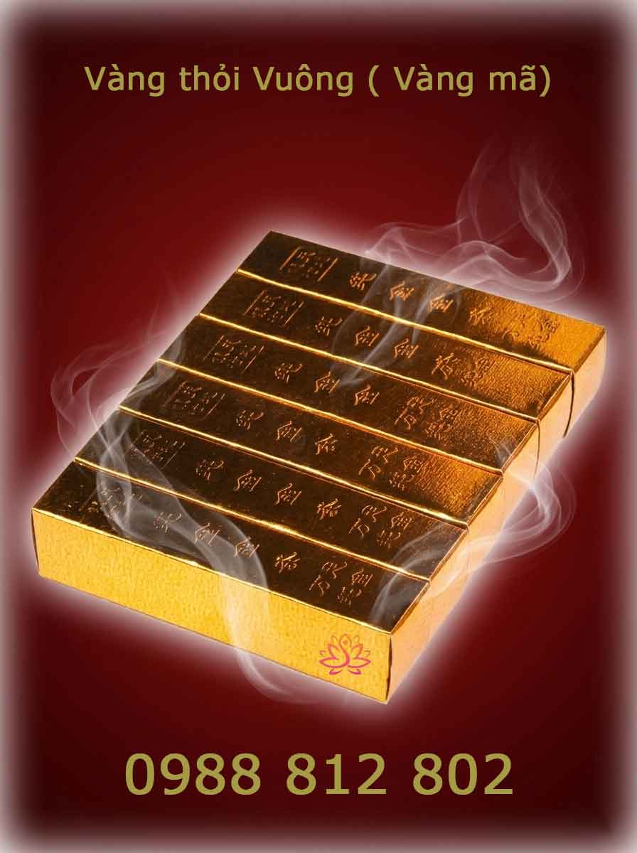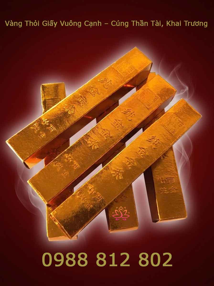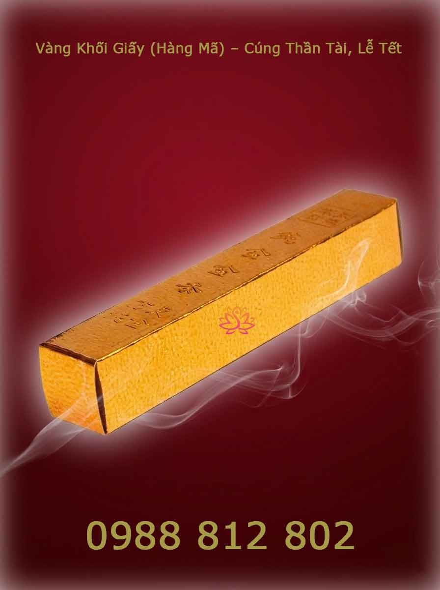 Vàng thỏi vuông cạnh (vàng khối giấy) là loại hàng mã được làm từ giấy bìa cứng phủ nhũ vàng hoặc bạc, dùng trong các nghi lễ cúng Thần Tài, Thổ Địa, khai trương và lễ Tết để cầu tài lộc, may mắn.